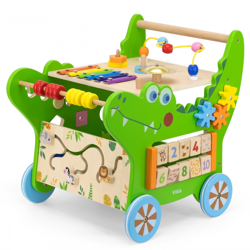 VIGA medinis stumdukas „Krokodiliukas” – tai daugybę veiklų apjungiantis žaislas, skirtas patiems mažiausiems. Jis ne tik padeda žengti pirmuosius žingsnius ir išlaikyti pusiausvyrą, bet ir suteikia vaikui įvairių lavinamųjų užduočių. Tvirta konstrukcija užtikrina stabilumą, o integruotos veiklos ugdo vaiko smalsumą, loginį mąstymą bei sensorinius gebėjimus.