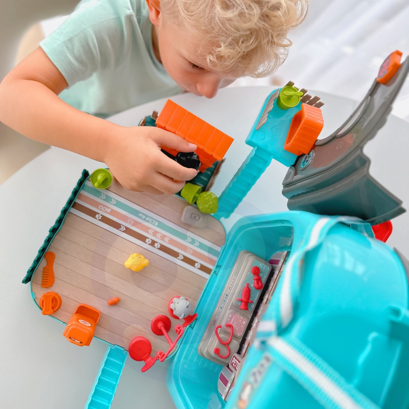 - Nešiojama lagaminėlis–kuprinė transformuojasi į veterinarijos ligoninę.